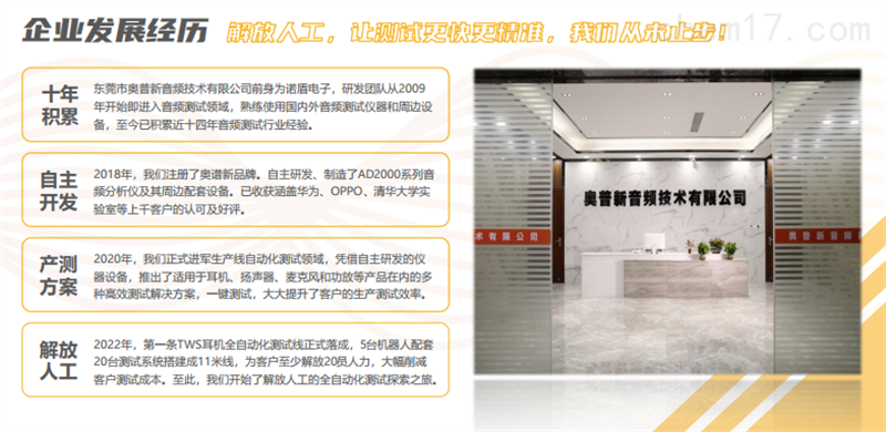 東莞市奧普新音頻技術(shù)有限公司創(chuàng)立于2018年,位于廣東省東莞市松山湖高新技術(shù)開發(fā)區(qū)工業(yè)南路4號松湖華科一棟6樓,是一家集研發(fā)、生產(chǎn)、銷售及服務(wù)為一體的自動(dòng)化音頻測試高科技企業(yè),公司擁有單機(jī)事業(yè)部、系統(tǒng)集成事業(yè)部和自動(dòng)化創(chuàng)新事業(yè)部,配備專業(yè)的研發(fā)實(shí)驗(yàn)室、消音室、生產(chǎn)車間、精密加工中心、品質(zhì)檢驗(yàn)測量室。核心研發(fā)團(tuán)隊(duì)在音頻測試領(lǐng)域深耕十多年,具備豐富的行業(yè)經(jīng)驗(yàn)和扎實(shí)的聲學(xué)基礎(chǔ),本著極至管理的目標(biāo)持續(xù)為客戶提供一站式高品質(zhì)音頻測試解決方案。把握時(shí)代脈搏,研發(fā)創(chuàng)新是企業(yè)永葆競爭力的源泉。奧普新是國家高新技術(shù)企業(yè),已獲得ISO、CE等國際質(zhì)量體系認(rèn)證,擁有20多項(xiàng)國家專力技術(shù)。因?yàn)楦鞣N聲音記錄著時(shí)代變遷,這些變遷通過音頻技術(shù)得以保存、交流與傳承,成為人類歷史的特殊記憶,而人類創(chuàng)新的歷史一次次刷新著聲音的表達(dá)極線,引嶺著人們追求更高品質(zhì)的卓悅生活,所以我們堅(jiān)持讓音頻測試快速響應(yīng)消費(fèi)者的真實(shí)需求,讓定制化產(chǎn)品成為尊貴客戶的專享。我們要?jiǎng)?chuàng)造一種新的音頻生態(tài)系統(tǒng),讓人類生活更健康、更快樂、效率更高。